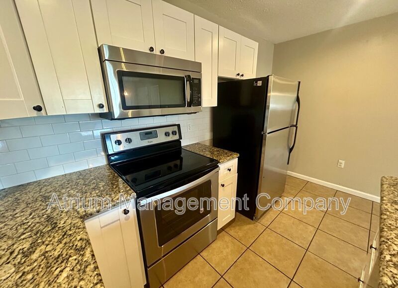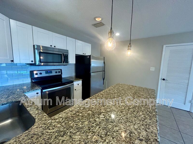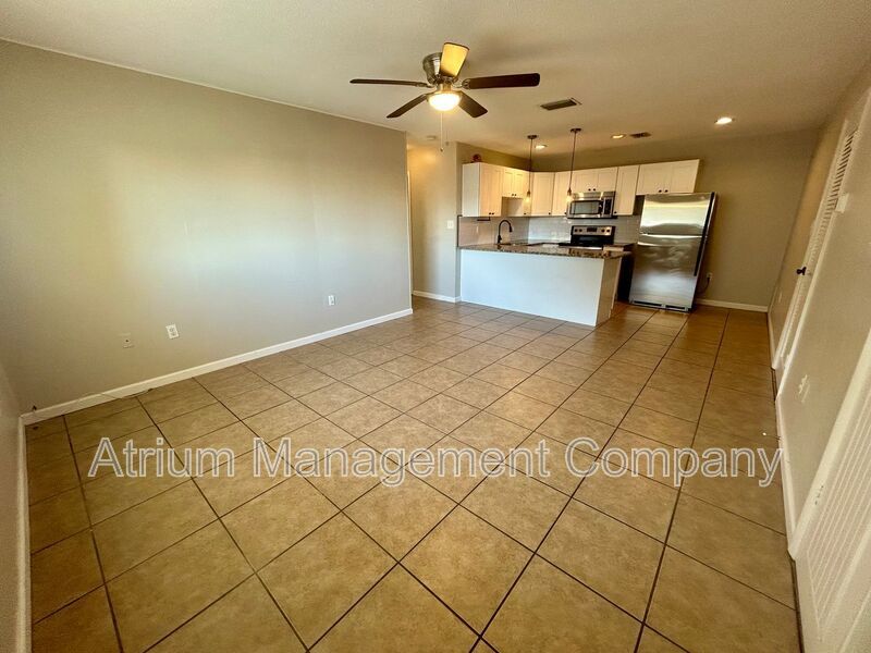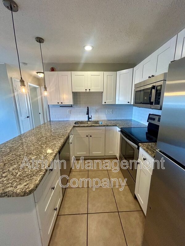 Step inside to find easy-to-maintain tile flooring throughout, creating a clean and modern look. The upgraded kitchen features white shaker cabinets, granite countertops, stylish subway tile backsplash, stainless steel appliances, dishwasher, undermount sink, and a breakfast bar with elegant drop lighting perfect for entertaining or casual dining.