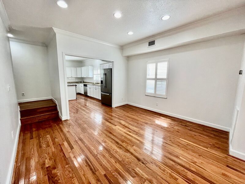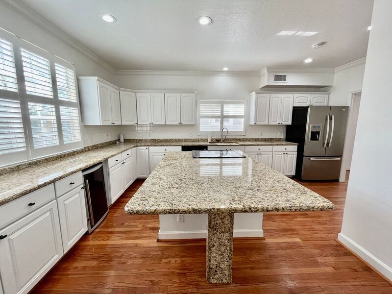 The impressive gourmet kitchen boasts expansive cabinet space, granite countertops, a wine cooler, stainless steel appliances, and a large center island perfect for hosting guests and dinner parties. Pendant lights add a stylish pop, and a dishwasher will make cleaning up after weekend brunch a breeze. Stylish stainles appliances and loads of counterspace make this a place where you will be glad to cook up special meals.