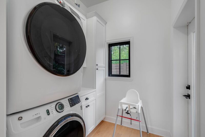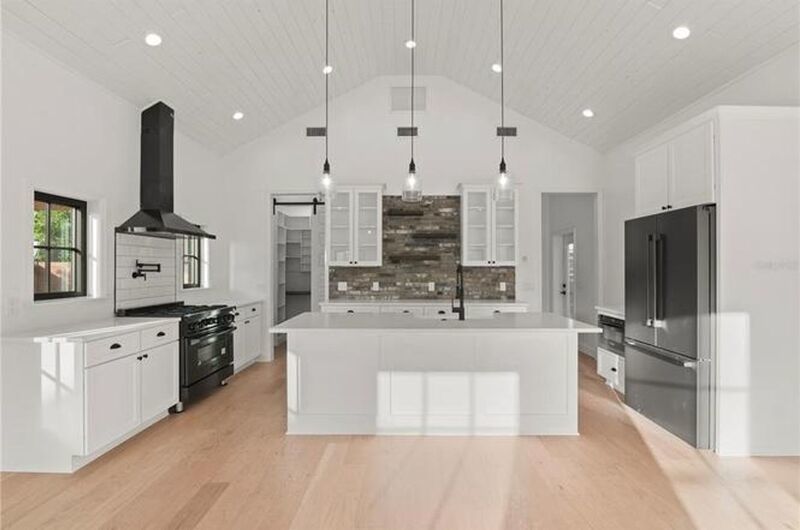 Step inside to find an open-concept layout where the kitchen and living areas blend effortlessly, highlighted by 14' ceilings, wood floors, and expansive windows that flood the space with natural light. The gourmet kitchen is a chef's dream, featuring contrasting light and dark finishes, grey brick and subway tile backsplash, quartz countertops, and top-of-the-line Zline stainless steel appliances including a Bosch refrigerator. A spacious walk-in pantry and adjacent mudroom with exterior access and GE stackable washer/dryer add to the convenience.