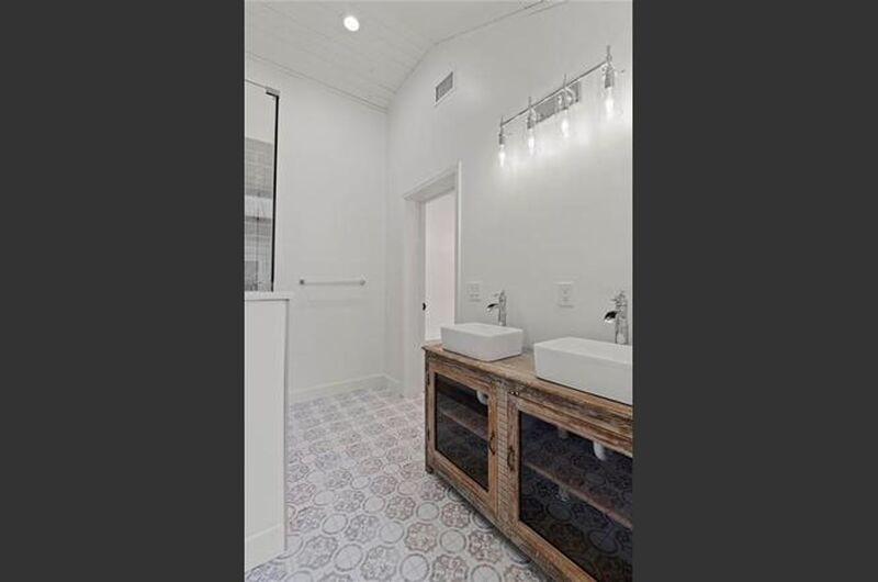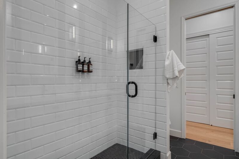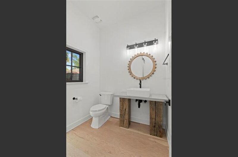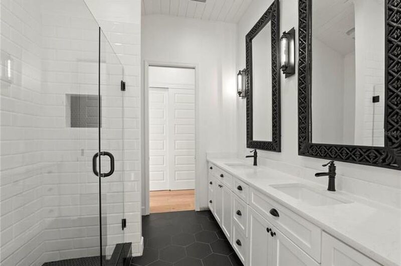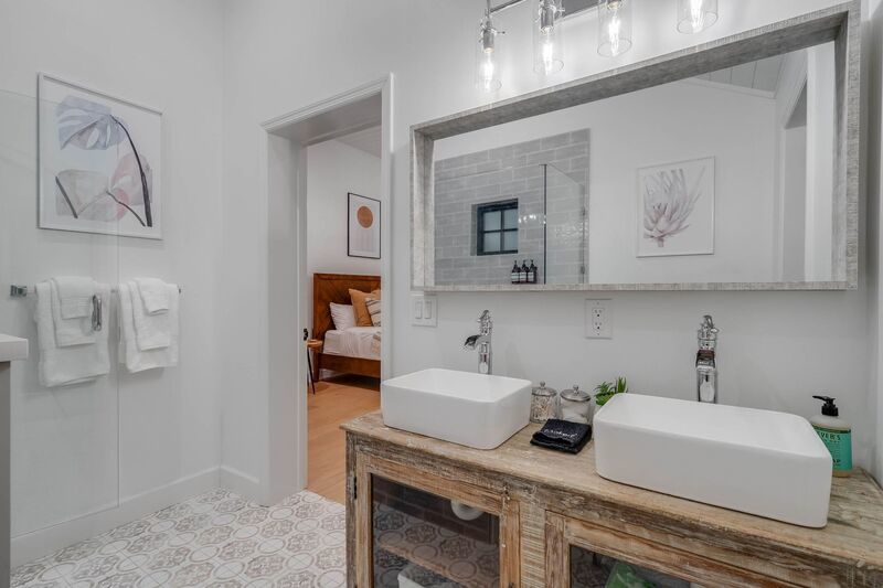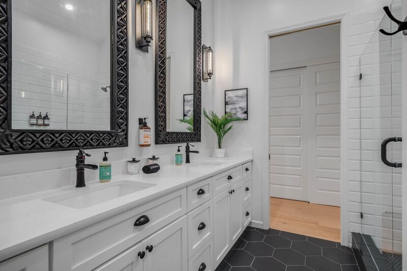 The primary suite offers a retreat-like atmosphere with a spa-inspired bathroom boasting dual sinks set on a rustic vanity, perfectly complementing the home's modern aesthetic. Each bedroom includes generous closets, while the guest bathroom features dual sinks, a glass-enclosed shower, and elegant tile finishes.
