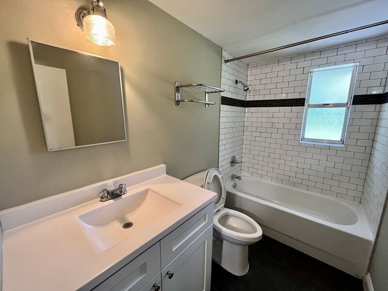 The cute bathroom has an upgraded tile surround on the tub/shower combo.