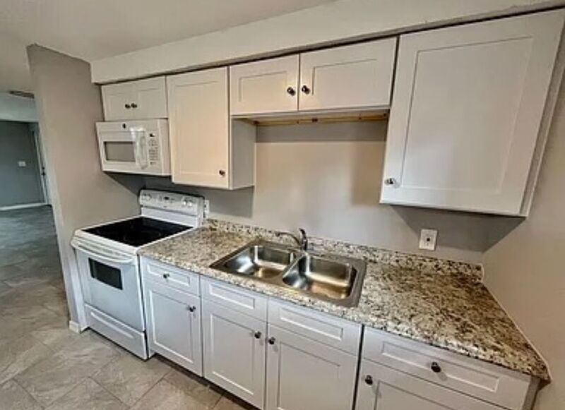 The oversized living/dining room boasts upscale rich, gleaming, wood look, easy care laminate vinyl flooring. The galley style kitchen has popular white cabinets, ample counter space, a full sized microwave, and a pantry. Stainless appliances complete the picture.