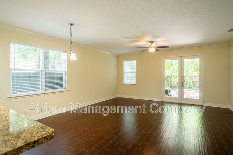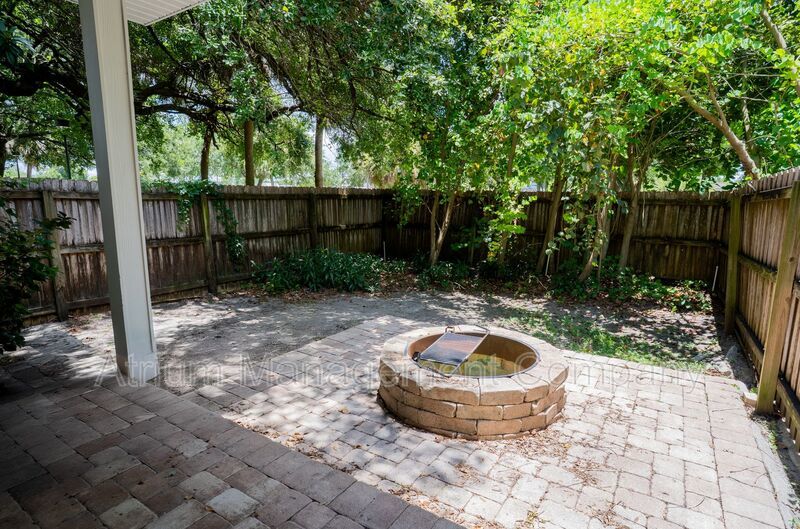 French doors leading to a private, fenced backyard with a cozy firepit—perfect for relaxing or entertaining