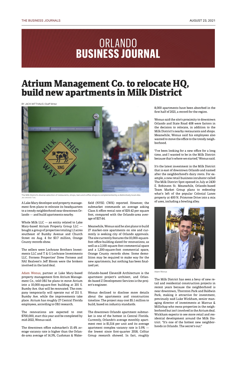 The Milk District has seen a bevy of new re-tail and residential construction projects in recent years because the neighborhood is near downtown, Thornton Park and Baldwin Park, making it attractive for investment, previously said Luke Wickham, senior man-aging director of investments at Marcus & Millichap who owns properties in the neighborhood but isn't involved in the Atrium deal. Wickham expects to see more retail and residential development around the Milk District. "It's one of the hottest new neighbor-hoods in Orlando. The secret's out."