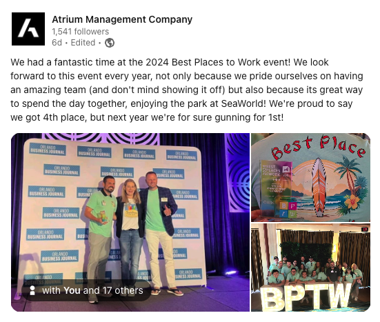 At Atrium Management Company, we believe that a successful business starts with a strong, supportive team. Our unique approach to attracting and retaining top talent is built on a foundation of authenticity, personal growth, and a deep commitment to community involvement. This philosophy not only helps us maintain a happy and motivated workforce but also ensures that we deliver exceptional service to our clients. We were recently recognized by the Orlando Business Journal as the #4 Best Place to Work in the small business category — you can see the OBJ’s writeup here.