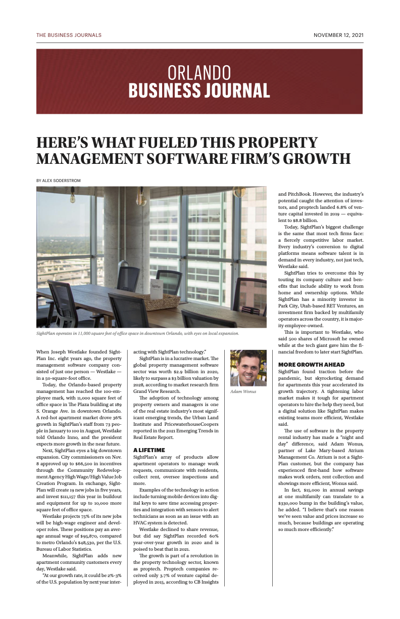 Today, the Orlando-based property management has reached the 100-employee mark, with 11,000 square feet of office space in The Plaza building at 189 S. Orange Ave. in downtown Orlando. A red-hot apartment market drove 36% growth in SightPlan’s staff from 73 people in January to 100 in August, Westlake told Orlando Inn, and the president expects more growth in the near future.