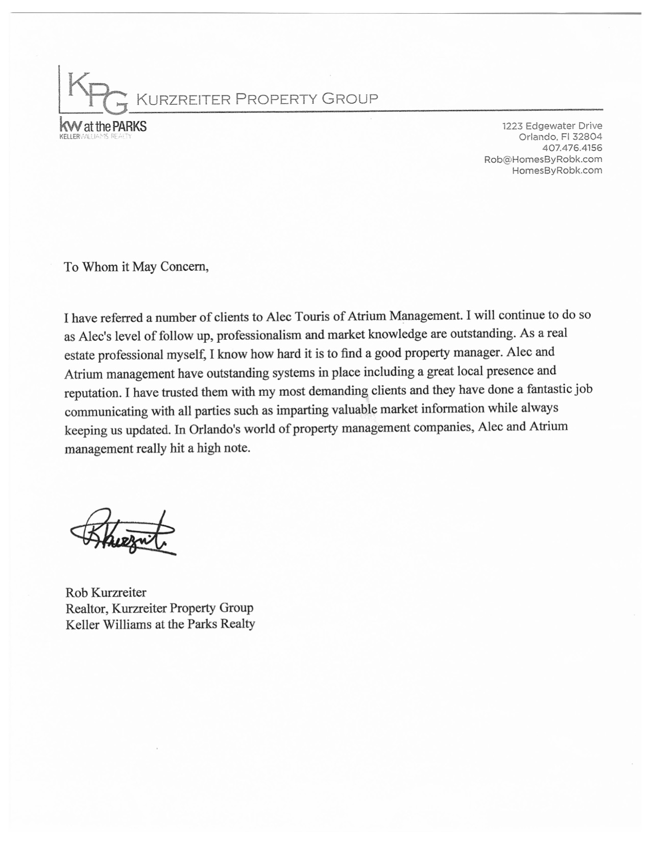 Kurzreiter Property Group Referral Testimonial Atrium Management Company - Monday, March 12, 2018 Read more here!
