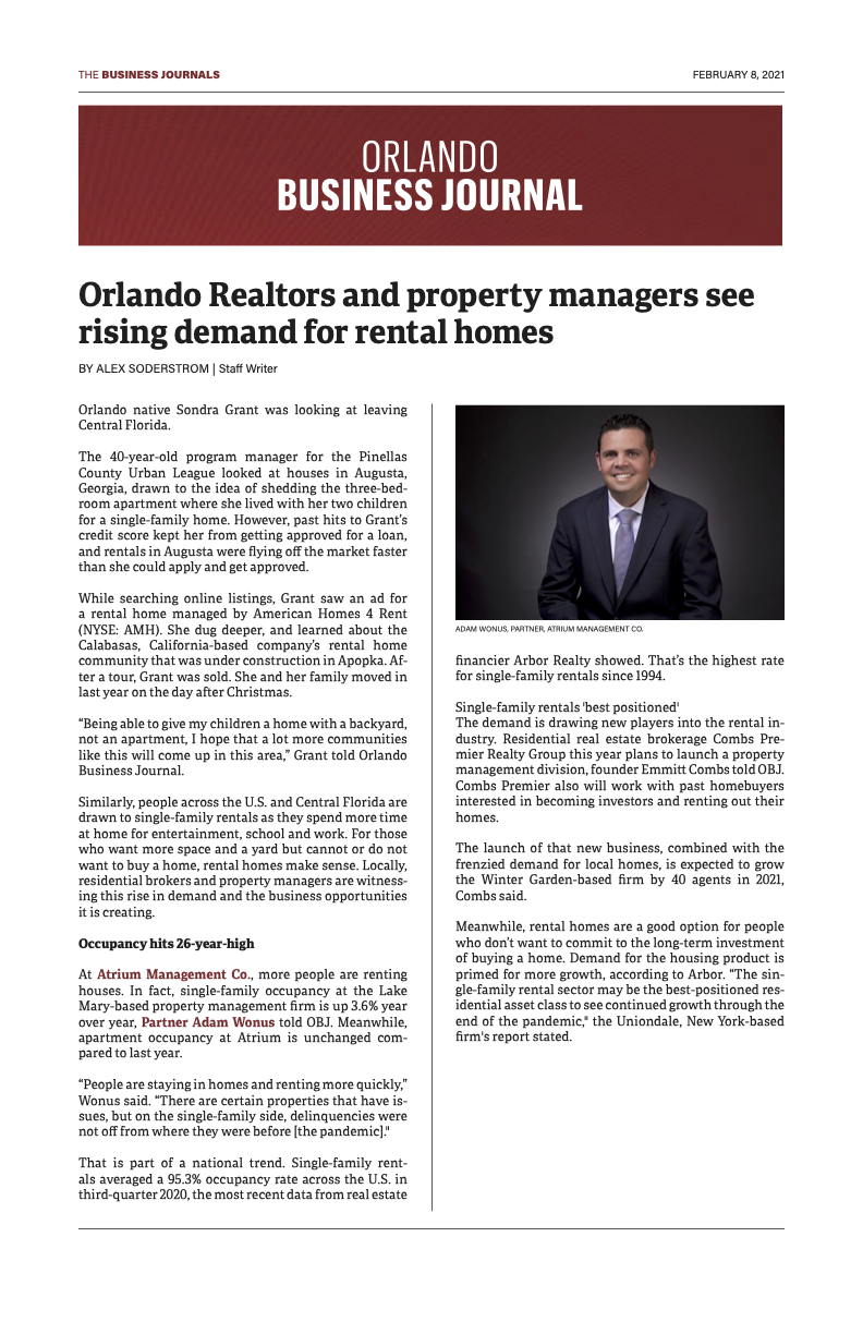 At Atrium Management Co., more people are renting houses. In fact, single-family occupancy at the Lake Mary-based property management firm is up 3.6% year over year, Partner Adam Wonus told OBJ. Meanwhile, apartment occupancy at Atrium is unchanged com-pared to last year.