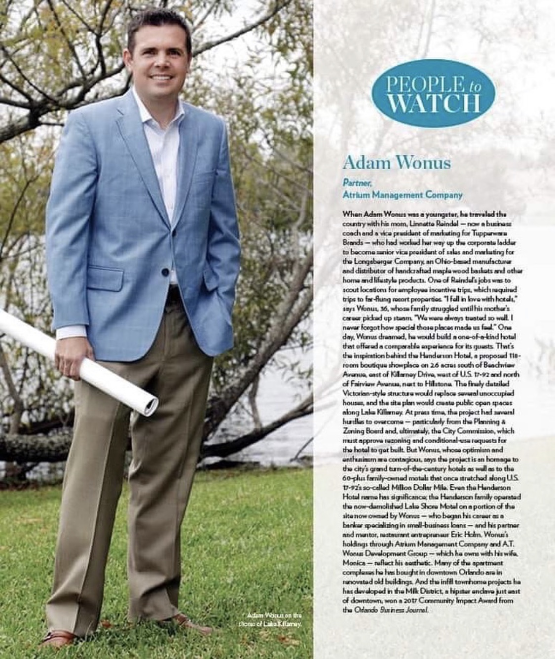 Wonus’s holdings through Atrium Management Company and A.T. Wonus Development Group — which he owns with his wife, Monica — reflect his aesthetic. Many of the apartment complexes he has bought in downtown Orlando are in renovated old buildings. And the infill townhome projects he has developed in the Milk District, a hipster enclave just east of downtown, won a 2017 Adam Wonus on the Community Impact Award from the Orlando Business Journal.